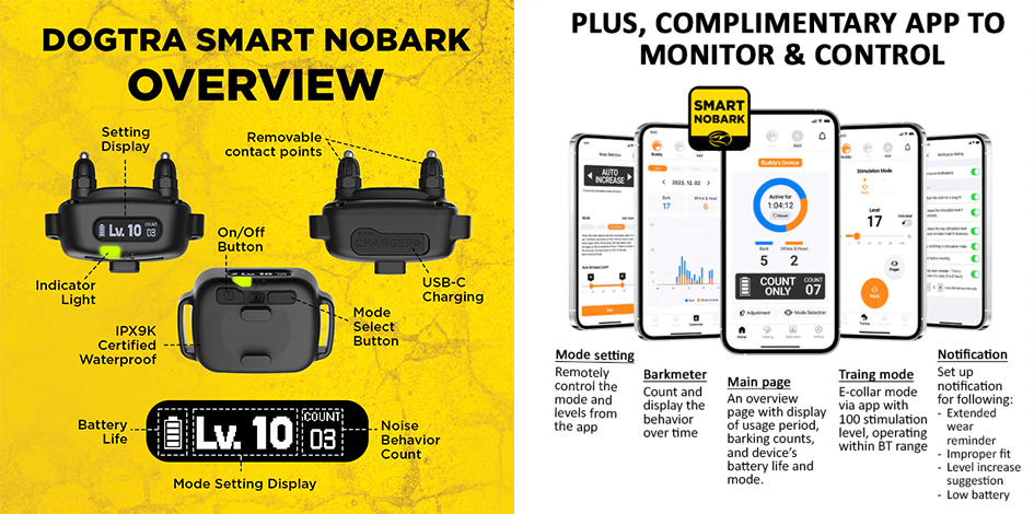 Το Dogtra Smart Nobark είναι το πιο ακριβές κολάρο κατά του γαβγίσματος που έχουμε μέχρι σήμερα. Ανιχνεύει γάβγισμα, κλαψούρισμα και ουρλιαχτό μέσω ενός συστήματος τριπλής ανίχνευσης που φιλτράρει τα ψευδή ερεθίσματα. Σε συνδυασμό με μια εφαρμογή που παρακολουθεί τη συμπεριφορά γαβγίσματος του σκύλου σας και προσφέρει έλεγχο e-collar, σας δίνει πλήρη επίβλεψη και έλεγχο, διασφαλίζοντας παράλληλα την ασφάλεια του σκύλου σας και βελτιώνοντας τη συμπεριφορά του στο γάβγισμα.