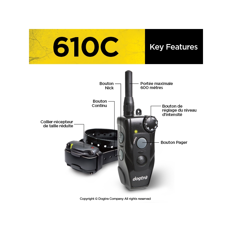 Το Dogtra 610C είναι ένα κολάρο επαγγελματικής εκπαίδευσης με εμβέλεια 600 μέτρων. Είναι πολύ πρακτικό και ακριβές γιακά. Είναι μοντέλο από τη σειρά των επαγγελματικών ηλεκτρικών κολάρων από την εταιρεία Dogtra. Έχει λειτουργία δόνησης και παλμού που μπορεί να ρυθμιστεί σε 100 επίπεδα. Το Dogtra 610NCP έχει εργονομικά διαμορφωμένο πομπό χωρίς οθόνη LCD, είναι φορτισμένο και διαθέτει εντελώς αδιάβροχο δέκτη. Είναι κατάλληλο για μικρές, μεσαίου μεγέθους και μεγάλες φυλές σκύλων. Μπορεί να επεκταθεί για την εκπαίδευση δύο σκύλων ταυτόχρονα. Οι ρυθμίσεις του ηλεκτρικού παλμού είναι πολύ άπλετες και η προειδοποίηση για τον σκύλο μπορεί να είναι πολύ ελαφριά. Τόσο το κολάρο όσο και ο πομπός έχουν πολύ ανθεκτική μπαταρία και διαρκούν αρκετές ημέρες κατά τη λειτουργία. Το κολάρο είναι εντελώς αδιάβροχο σε βάθος 1 μέτρου. Το Dogtra 610C μπορεί να επεκταθεί στην εκπαίδευση δύο σκύλων ταυτόχρονα Dogtra 612C.
