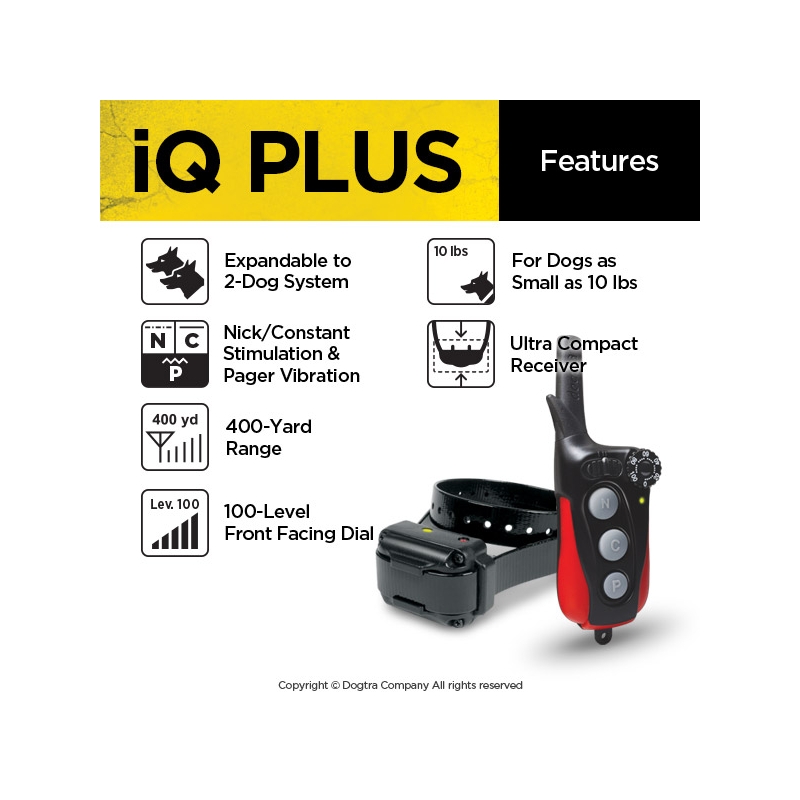 Το Dogtra iQ plus είναι ένα στολίδι ανάμεσα στο κολάρο εκπαίδευσης Είναι πολύ μικρό και εύχρηστο ηλεκτρικό κολάρο με 400 μέτρα (365 μέτρα) εμβέλεια. Έχει λειτουργία δόνησης και ηλεκτρικού παλμού σε 100 επίπεδα. Το ηλεκτρικό κολάρο Dogtra iQ Plus έχει εργονομικό σχήμα, έχει πλαστικά ηλεκτρόδια και είναι πλήρως αδιάβροχο έως 1 μέτρο. Μπορεί να επεκταθεί για την εκπαίδευση δύο σκύλων. Το κολάρο είναι κατάλληλο για κάθε είδος σκύλου χάρη στα 100 διαφορετικά επίπεδα ηλεκτρικού παλμού. Συνιστάται για σκύλους μεταξύ 4.5 και 18 κιλών. Το κολάρο είναι πλήρως αδιάβροχο σε βάθος 1 μέτρου.