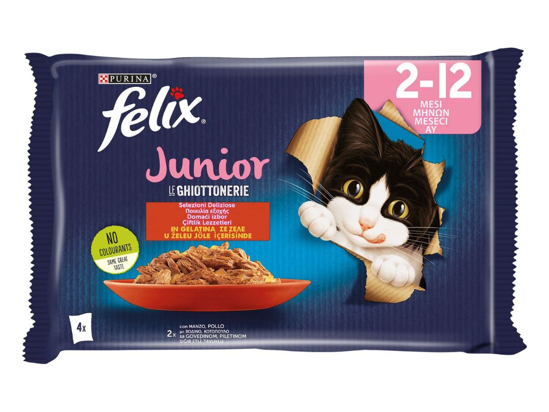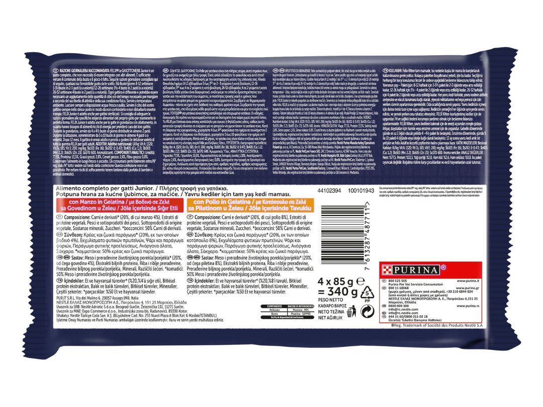 Φακελάκι υγρής τροφής για Γάτες. FELIX AGAIL JUNIOR Πολυσυσκευασία με Βοδινό και Κοτόπουλο σε Ζελέ 4x85g
