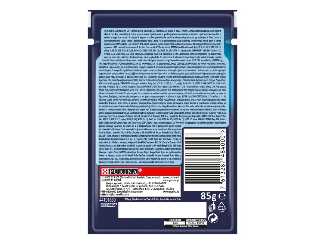 Κρέας και ζωικά παράγωγα* (12%), Εκχυλίσματα φυτικών πρωτεϊνών, Ψάρι και παράγωγα ψαριών (σολομός 4%), Λαχανικά (0.8% αφυδατωμένα κολοκυθάκια. ισοδύναμο με 7.2% κολοκυθάκια), Ανόργανα άλατα, Σάκχαρα.