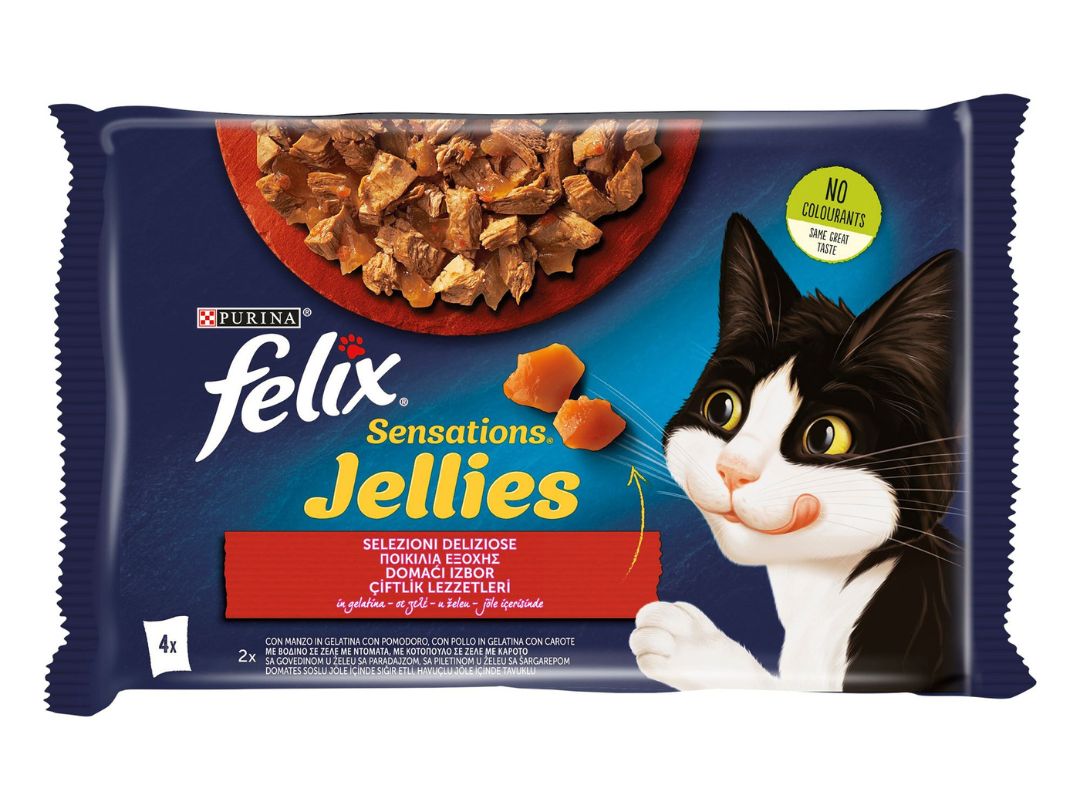 Φακελάκι υγρής τροφής για Γάτες. FELIX Sensations Jellies Πολυσυσκευασία με Βοδινό και Κοτόπουλο 4x85g