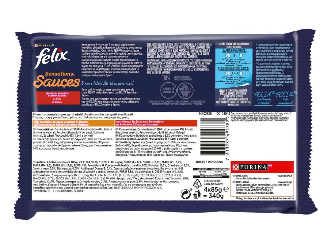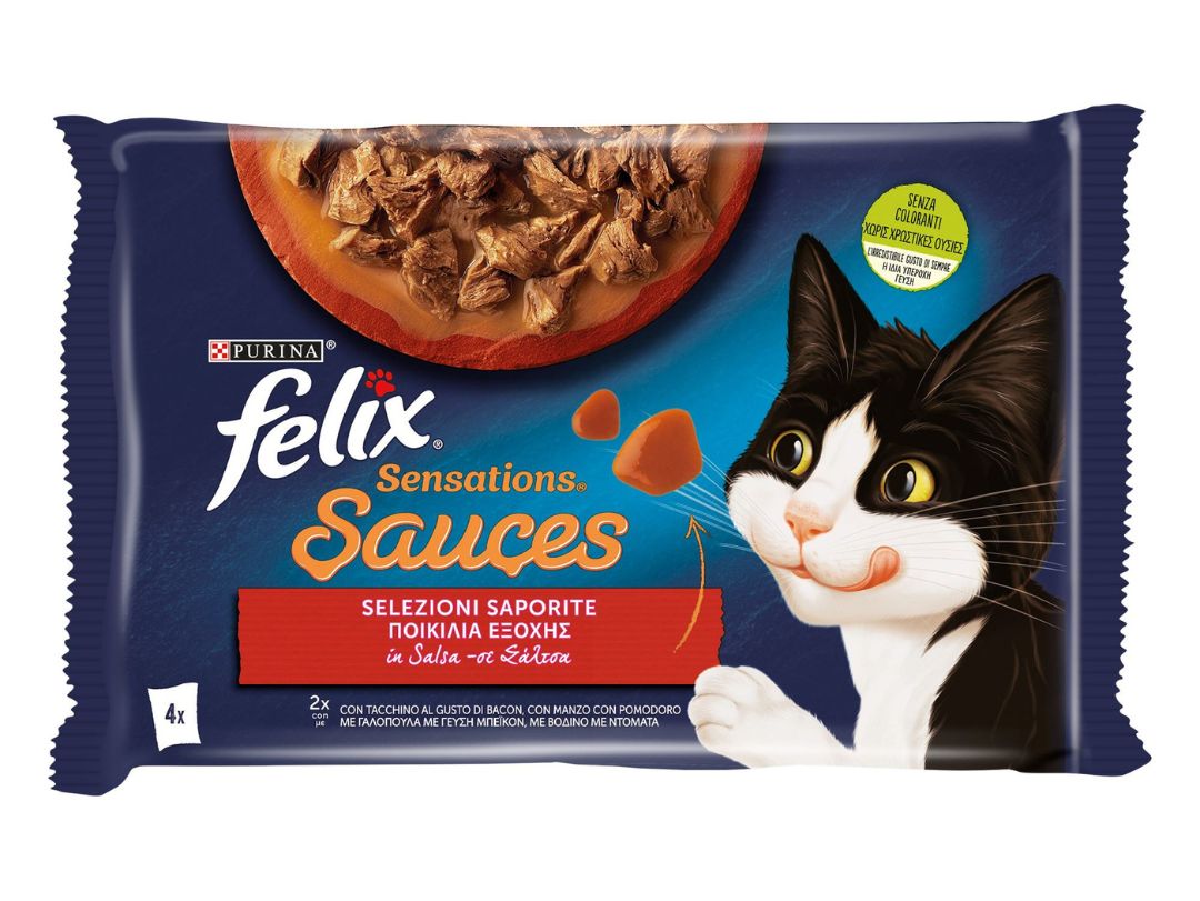 Φακελάκι υγρής τροφής για Γάτες. FELIX Sensations Sauces Πολυσυσκευασία με Γαλοπούλα με γεύση Μπέικον και με Βοδινό με Ντομάτα 4x85g