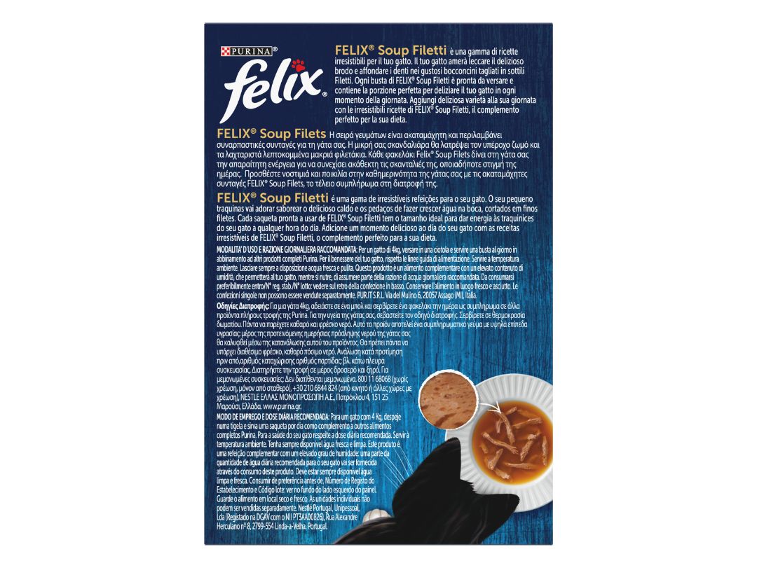 Η σειρά γευμάτων FELIX® Soup Filets είναι ακαταμάχητη και περιλαμβάνει συναρπαστικές συνταγές για τη γάτα σας. Οποιαδήποτε στιγμή της ημέρας, ο μικρός σας ρακένδυτος θα λατρέψει τον υπέροχο ζωμό και να πιάσει στα δόντια του τα λαχταριστά κομμάτια κομμένα σε μακριά λεπτά φιλέτα.