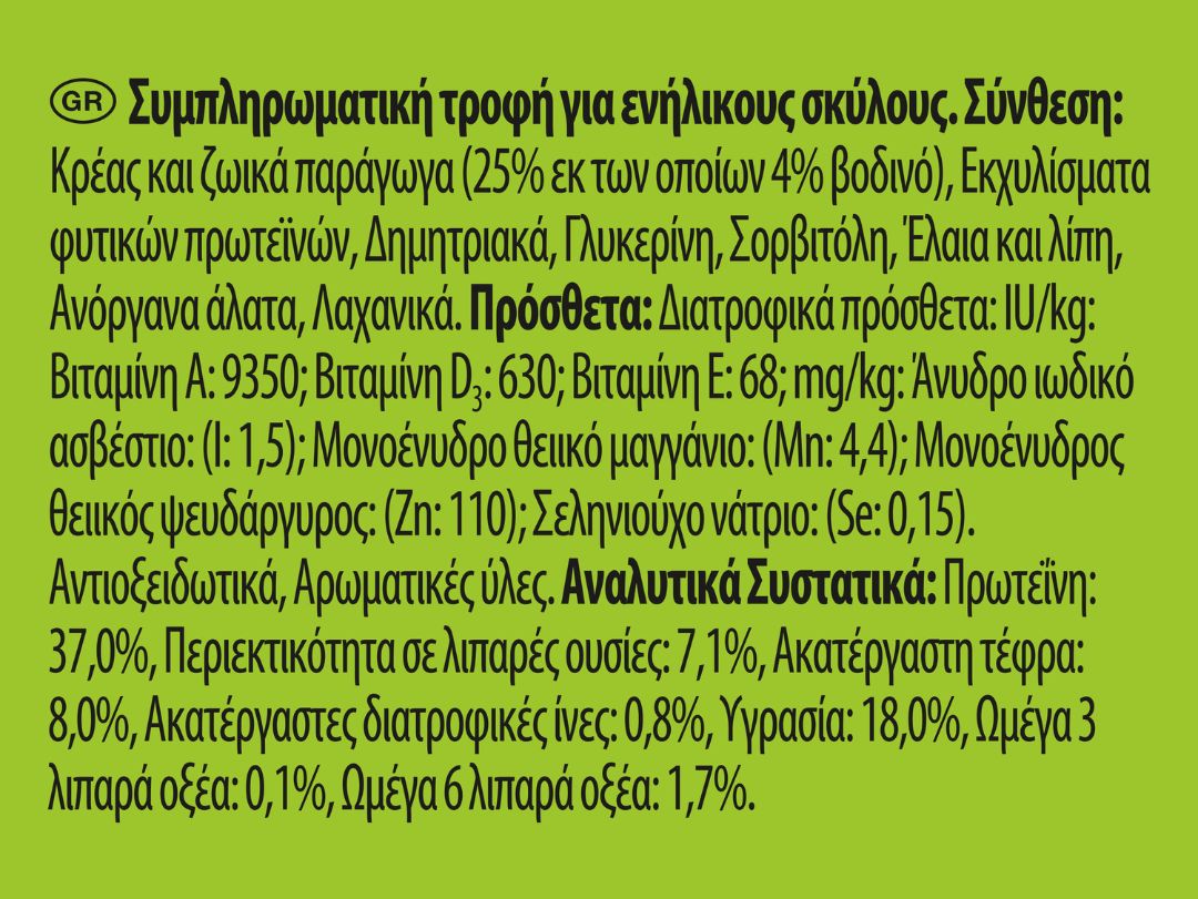 Κρέας και ζωικά παράγωγα (25%)*, Εκχυλίσματα φυτικών πρωτεϊνών, Δημητριακά, Γλυκερόλη, Σορβιτόλη, Έλαια και Λίπη, Ανόργανα Άλατα, Λαχανικά.*ισοδύναμο με 40% ανασυσταμένο κρέας, με κατ' ελάχιστο 26% κρέας και κατ' ελάχιστο 4% βοδινό.
