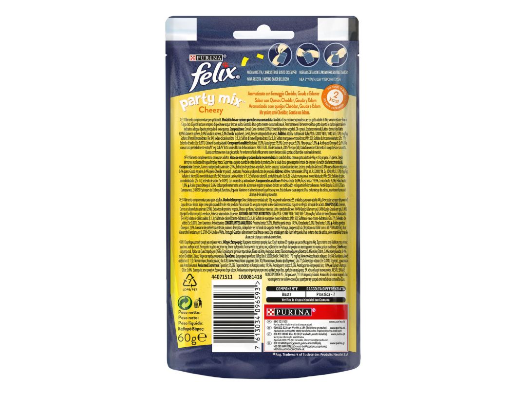 Κάθε σακουλάκι Felix Party Mix περιέχει πρωτεΐνες, βιταμίνες και Ωμέγα 6 λιπαρά οξέα, χωρίς πρόσθετες τεχνητές χρωστικές, για να βοηθάει τη γάτα σας να ζει μια υγιή και ευτυχισμένη ζωή.Συμπληρωματικό snack για ενήλικες γάτες.