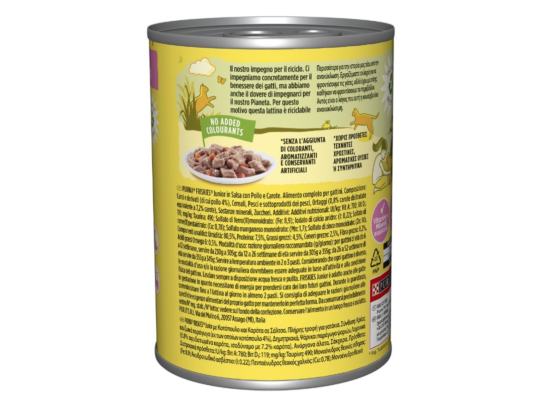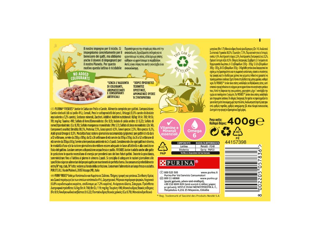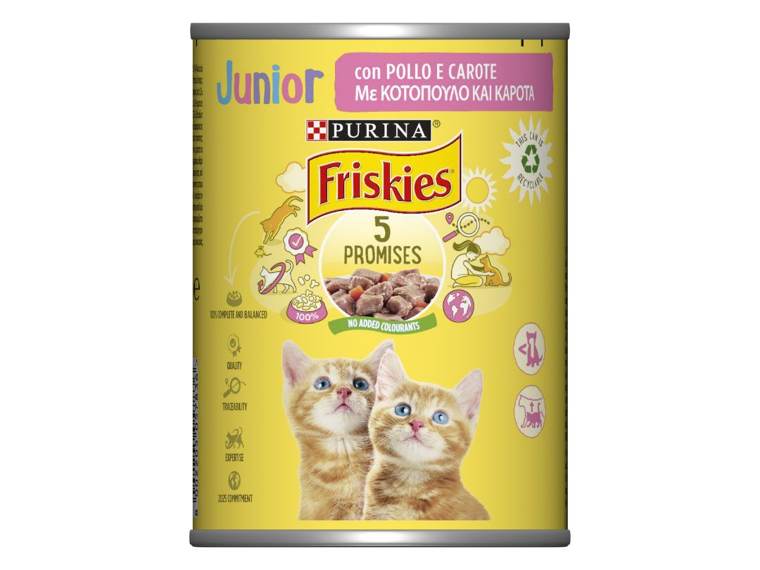 Friskies Junior Κομματάκια Κοτόπουλο & Καρότα σε σάλτσα 400g. Πλήρης τροφή για γατάκια.