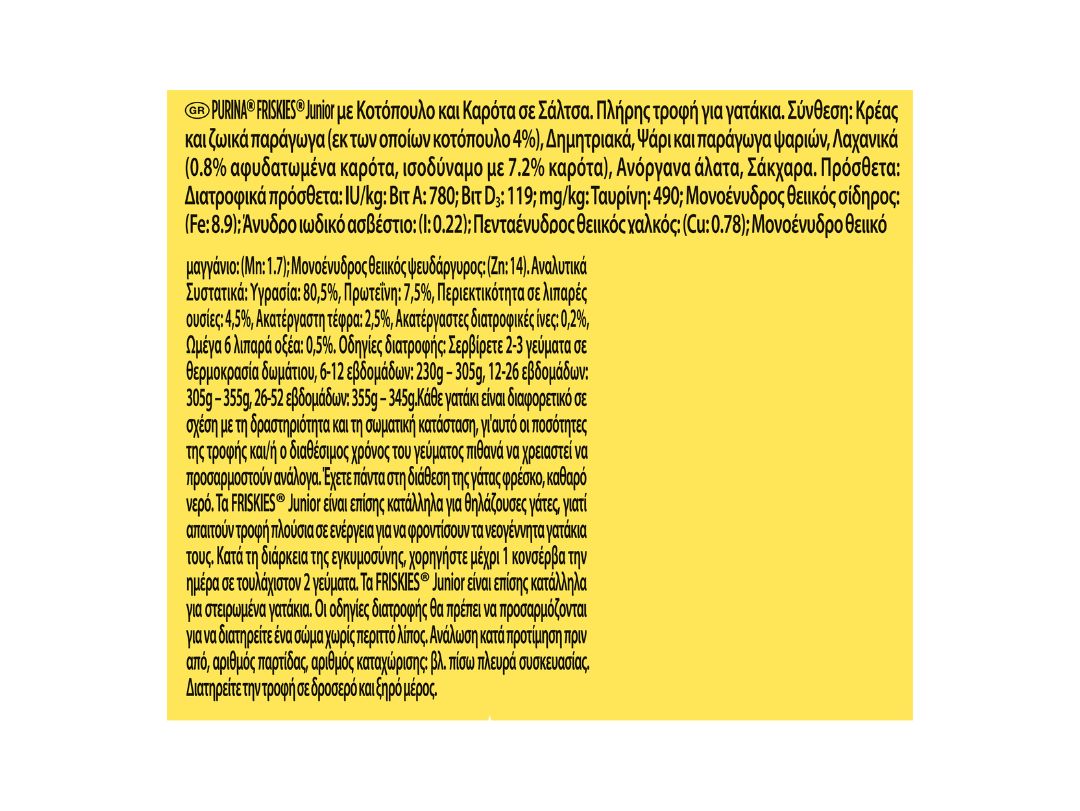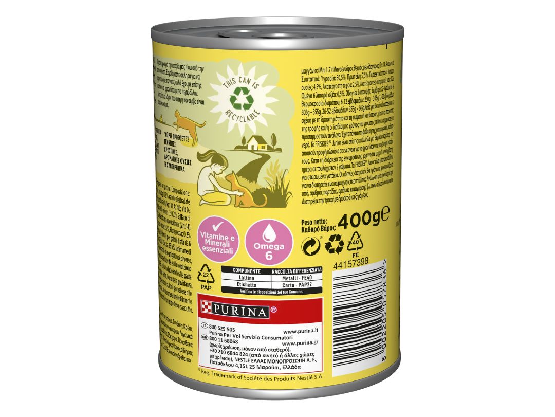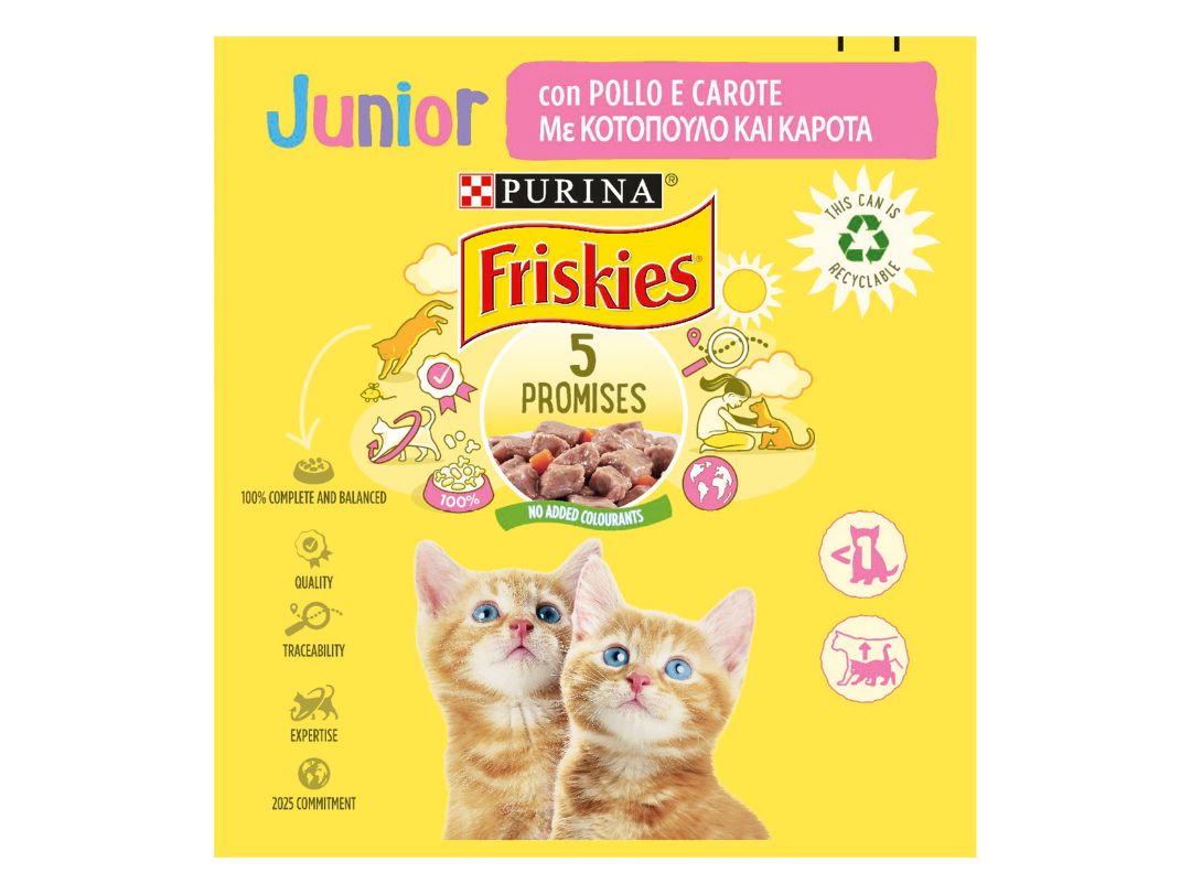 Για μια υγιή ανάπτυξη το γατάκι σας χρειάζεται μια συγκεκριμένη διατροφή. Το Friskies Junior είναι μια πλήρης και ισορροπημένη τροφή που προσφέρει όλα τα απαραίτητα θρεπτικά συστατικά, τις βιταμίνες και τα ανόργανα άλατα που χρειάζεται για να διασφαλίζεται η μετάβαση από το μητρικό γάλα στη στερεή τροφή. Προσφέρετε στο γατάκι σας ένα εξαιρετικό ξεκίνημα στη ζωή με το Friskies Junior - έτσι ώστε να σας εκπλήσεει και να φέρνει χαρά στο σπιτικό σας κάθε μέρα!