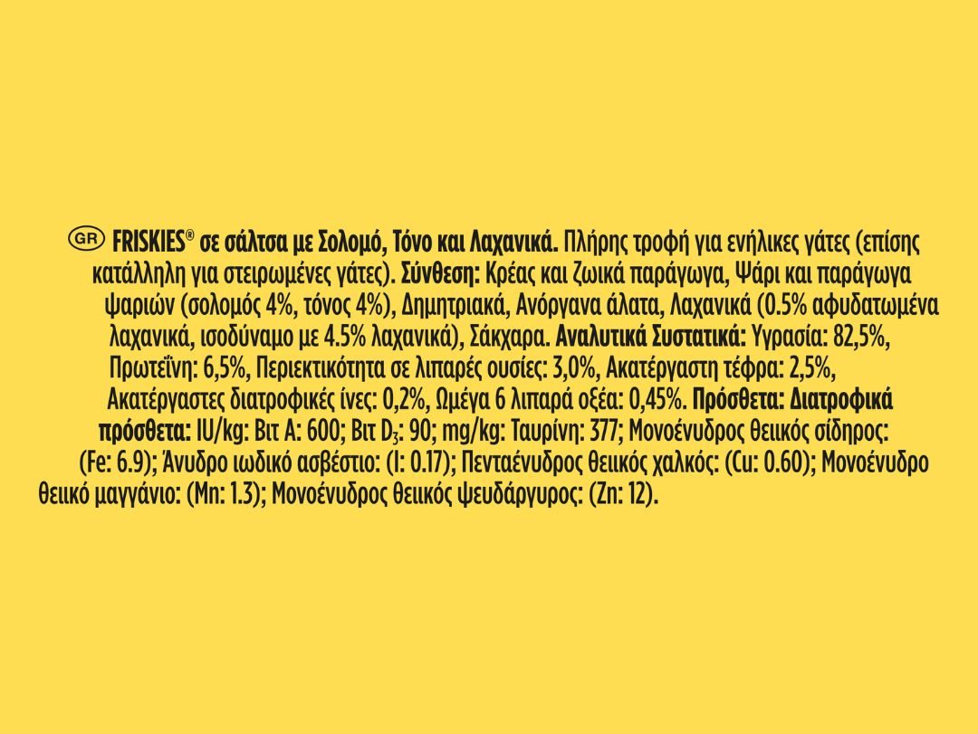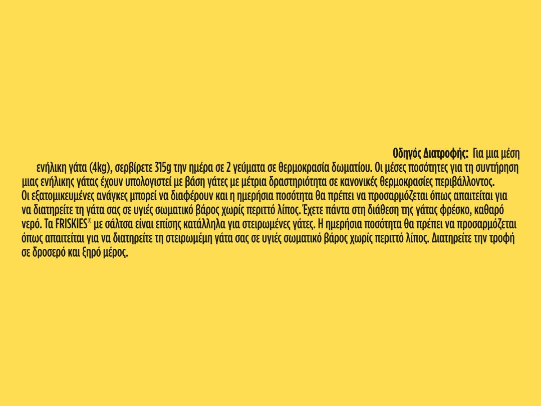 Τα FRISKIES® με σάλτσα είναι επίσης κατάλληλα για στειρωμένες γάτες.H ημερήσια ποσότητα θα πρέπει να προσαρμόζεται όπως απαιτείται για να διατηρείτε τη στειρωμέμη γάτα σας σε υγιές σωματικό βάρος χωρίς περιττό λίπος.