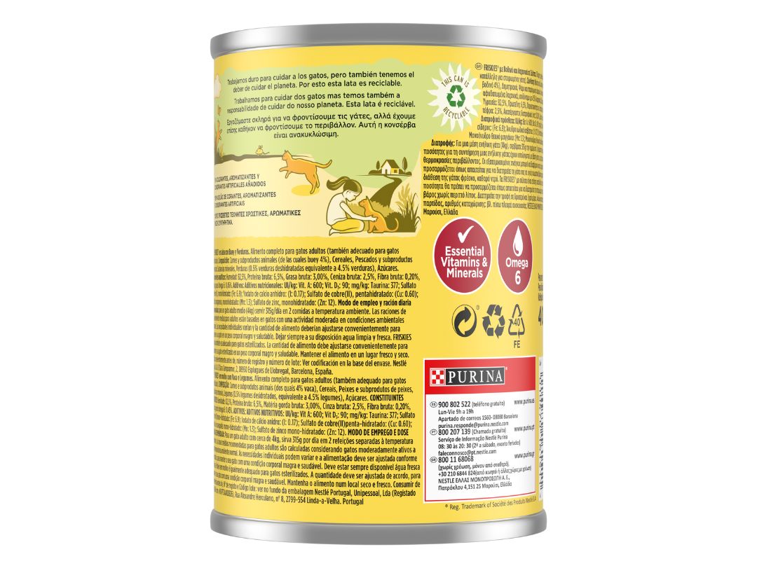 Οι γάτες μας είναι εξερευνητές από τη φύση τους και αντιλαμβάνονται τα πάντα στο περιβάλλον τους. Γι' αυτό οι ειδικοί της Purina® έχουν δημιουργήσει τα Friskies® για ενήλικες γάτες: νόστιμη, ποιοτική τροφή για γάτες, προσεκτικά ισορροπημένη για να θρέφει το αστείρευτο ενδιαφέρον του εξερευνητή σας για τον κόσμο. Χωρίς Πρόσθετες Τεχνητές Χρωστικές, Αρωματικές ύλες ή Συντηρητικά. Τα Friskies® προσφέρουν στον τολμηρό εξερευνητή σας όλα τα απαραίτητα διατροφικά στοιχεία που χρειάζεται και την υπέροχη γεύση που αγαπά, για να καλλιεργήσουν τις συνεχείς ανακαλύψεις του και να τον κρατήσουν υγιή και χαρούμενο.