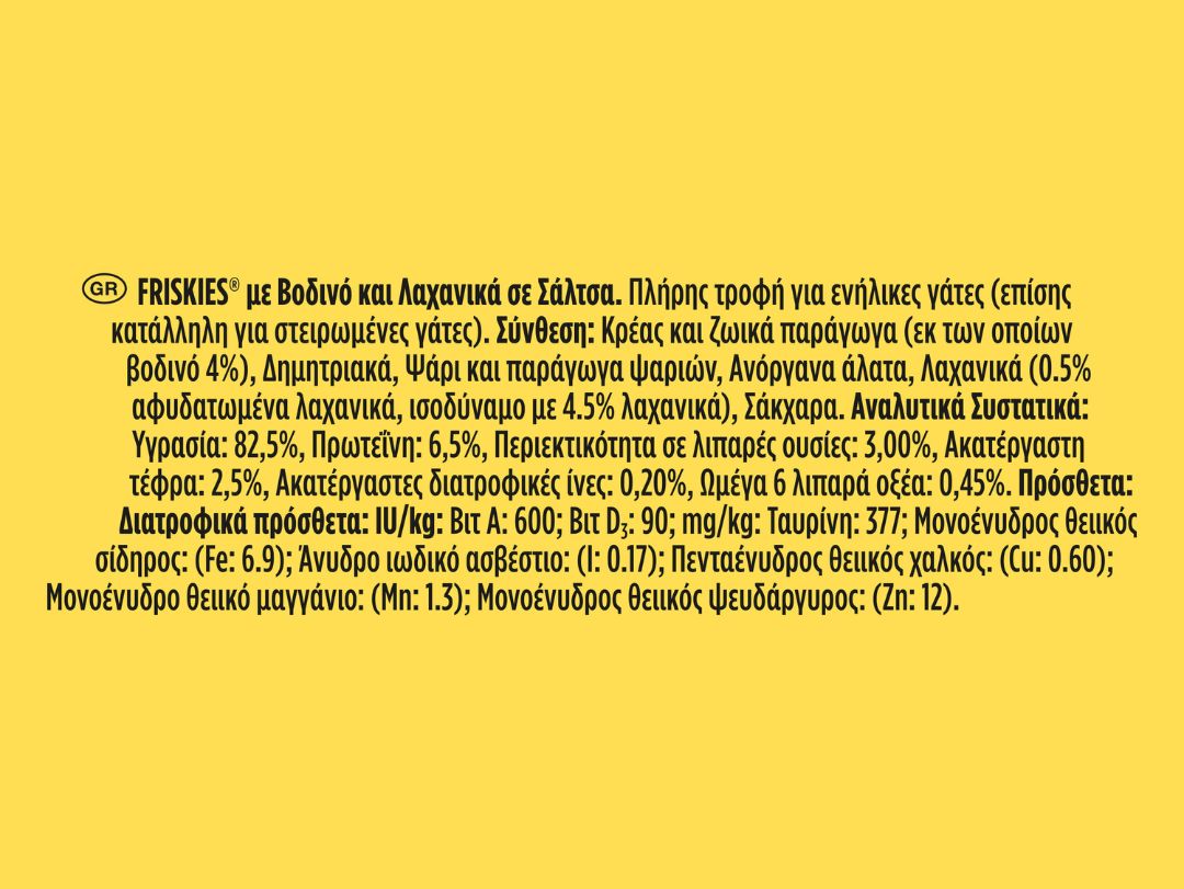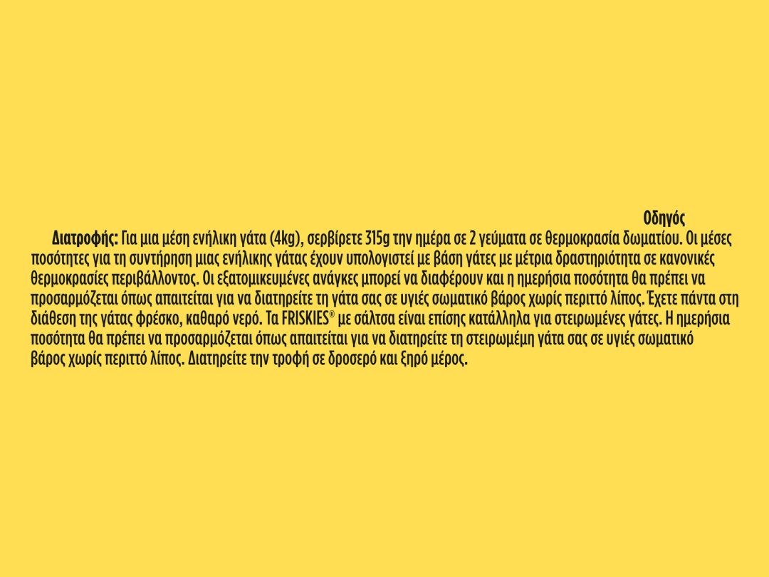 Τα FRISKIES® με σάλτσα είναι επίσης κατάλληλα για στειρωμένες γάτες.H ημερήσια ποσότητα θα πρέπει να προσαρμόζεται όπως απαιτείται για να διατηρείτε τη στειρωμέμη γάτα σας σε υγιές σωματικό βάρος χωρίς περιττό λίπος.