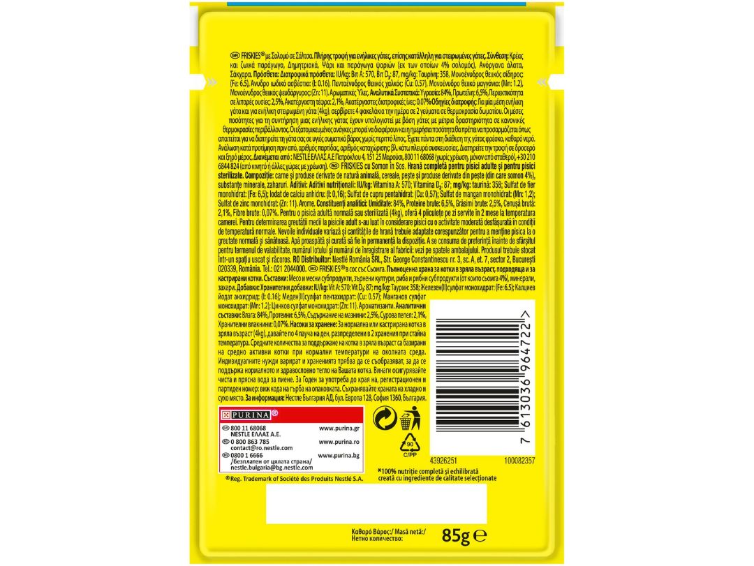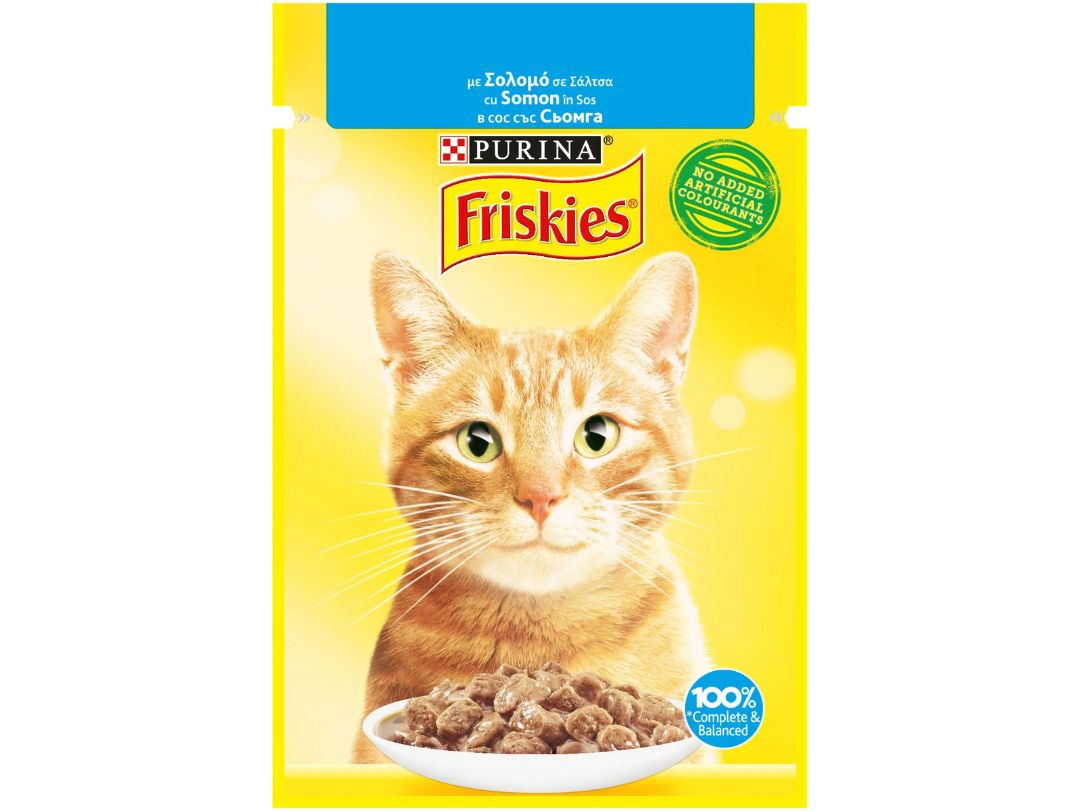 Friskies® πλήρης τροφή για ενήλικες γάτες με Σολομό σε σάλτσα - φακελάκι 85g