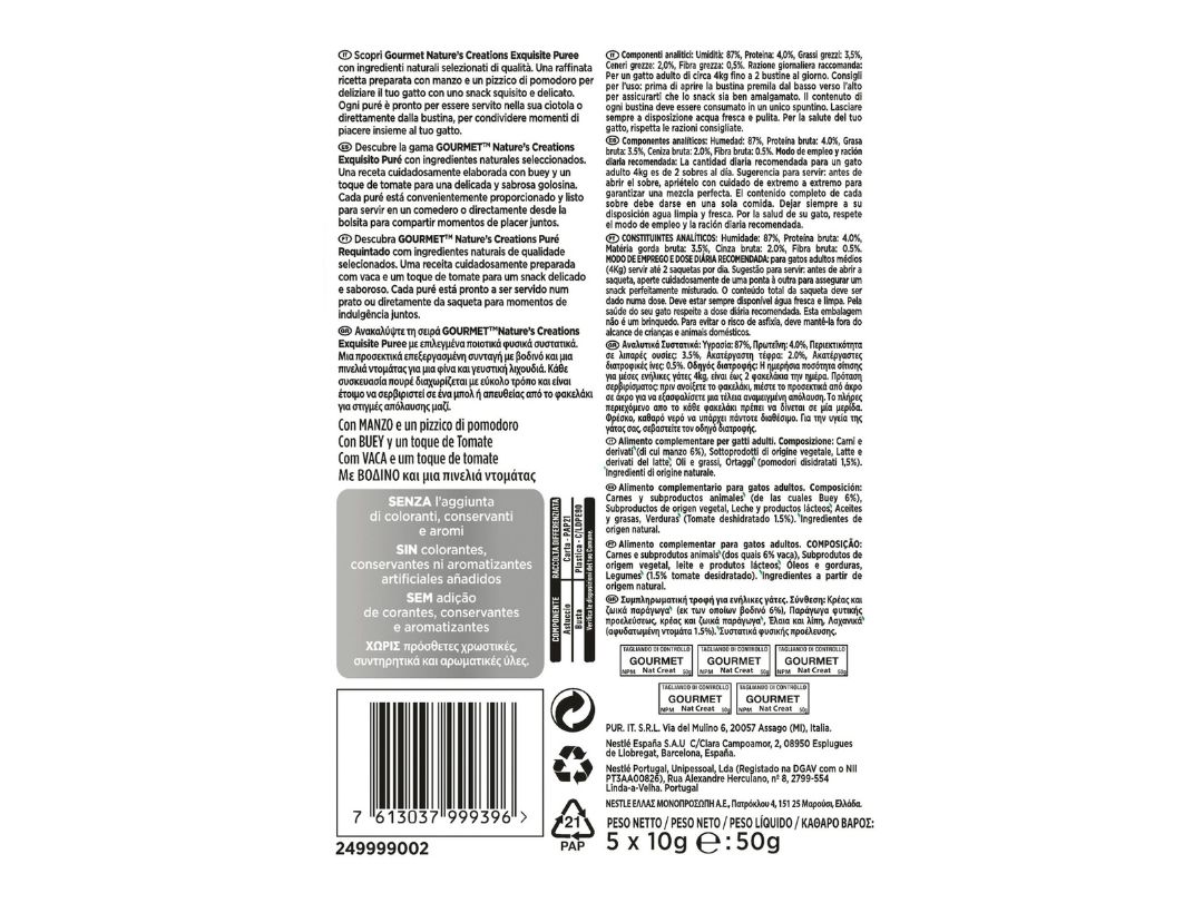 GOURMET NATURE'S CREATIONS PUREE με Βοδινό και Τομάτα (5Χ10g)
