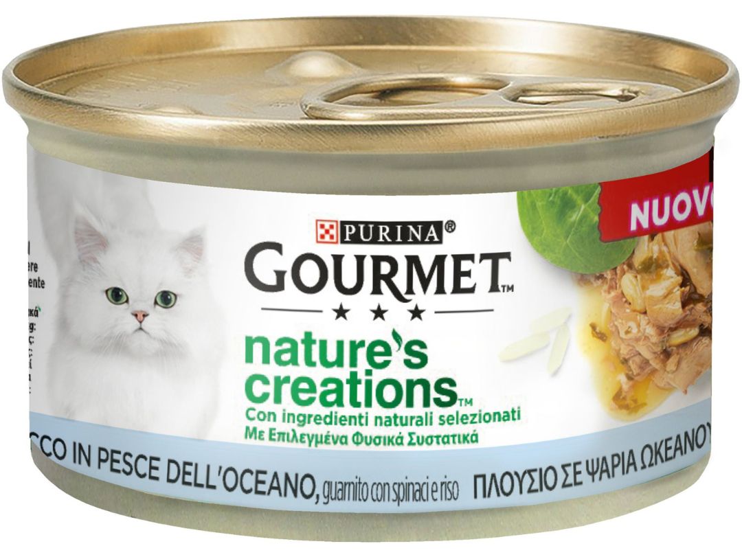 Πλήρης Τροφή για Ενήλικες Γάτες GOURMET NATURE'S CREATIONS με Ψάρια Ωκεανού, γαρνιρισμένο με σπανάκι και ρύζι 85g