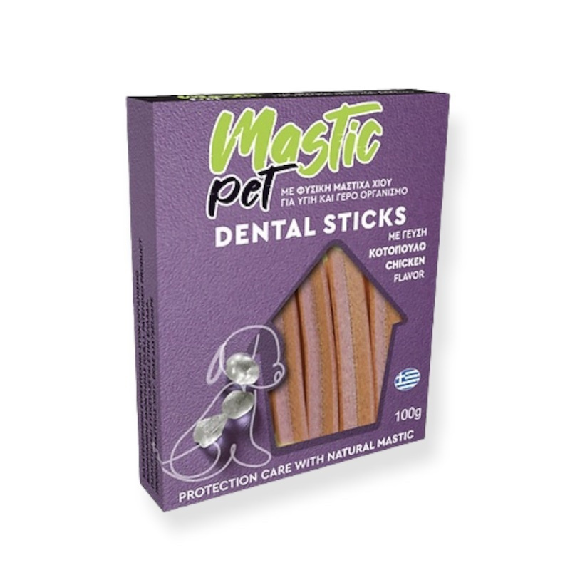 Τo Mastic Pet είναι μια εκλεκτή σειρά Dental sticks για όλους τους σκύλους και γάτες όπου έχει αποδεδειγμένες αντιβακτηριδιακές και αντιφλεγμονώδεις ιδιότητες. Η γνήσια μαστίχα Χίου και τα φυσικά συστατικά που περιέχει δρουν ευεργετικά στον οργανισμό του σκύλου. Ενδείκνυται για δυσπεπτικά προβλήματα, καούρες, διάρροιες και τη μείωση σχηματισμού οδοντικής πλάκας και της κακοσμίας , δρα ευεργετικά κατά της οστεοπόρωσης και βοηθά τις αρθώσεις.