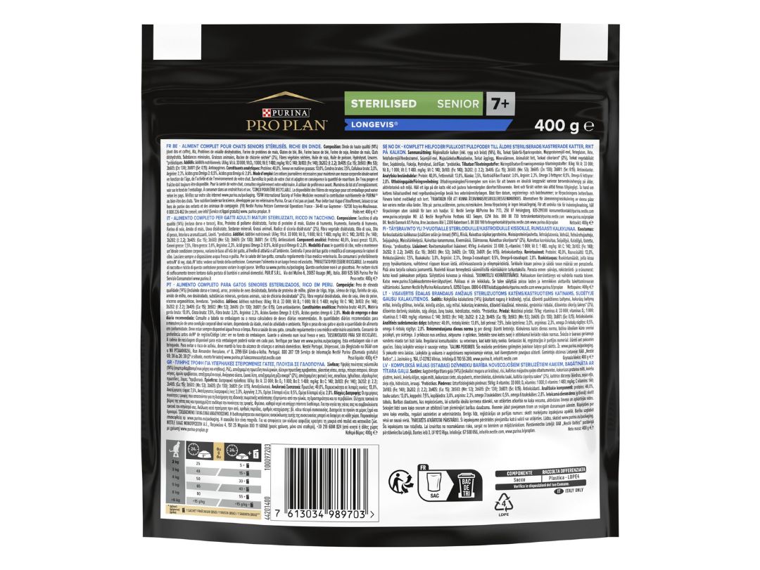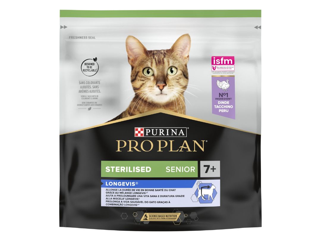 H Pro Plan Sterilised 7+, απευθύνεται σε στειρωμένες γάτες ηλικίας 7+ και άνω και περιέχει το διατροφικό μείγμα LONGEVIS ® , ένα μοναδικό μείγμα θρεπτικών συστατικών στα οποία περιλαμβάνονται αντιοξειδωτικά, ωμέγα 3 & 6 λιπαρά οξέα και ένα πρεβιοτικό, που αποδεδειγμένα* παρατείνει την υγιή ζωή και βελτιώνει την ποιότητα της ζωής των γατών 7+ ετών.