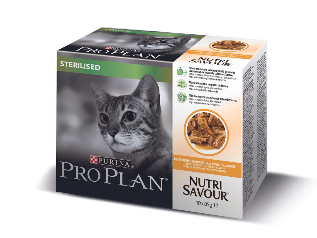 H PRO PLAN περιέχει συγκεκριμένους συνδυασμούς συστατικών, επιστημονικά σχεδιασμένους για να επηρεάσουν την μακρόχρονη υγεία της γάτας. Η PRO PLAN STERILISED NUTRISAVOUR είναι μία πλήρης τροφή για ενήλικες γάτες με τρυφερά κομματάκια με κοτόπουλο σε σάλτσα.