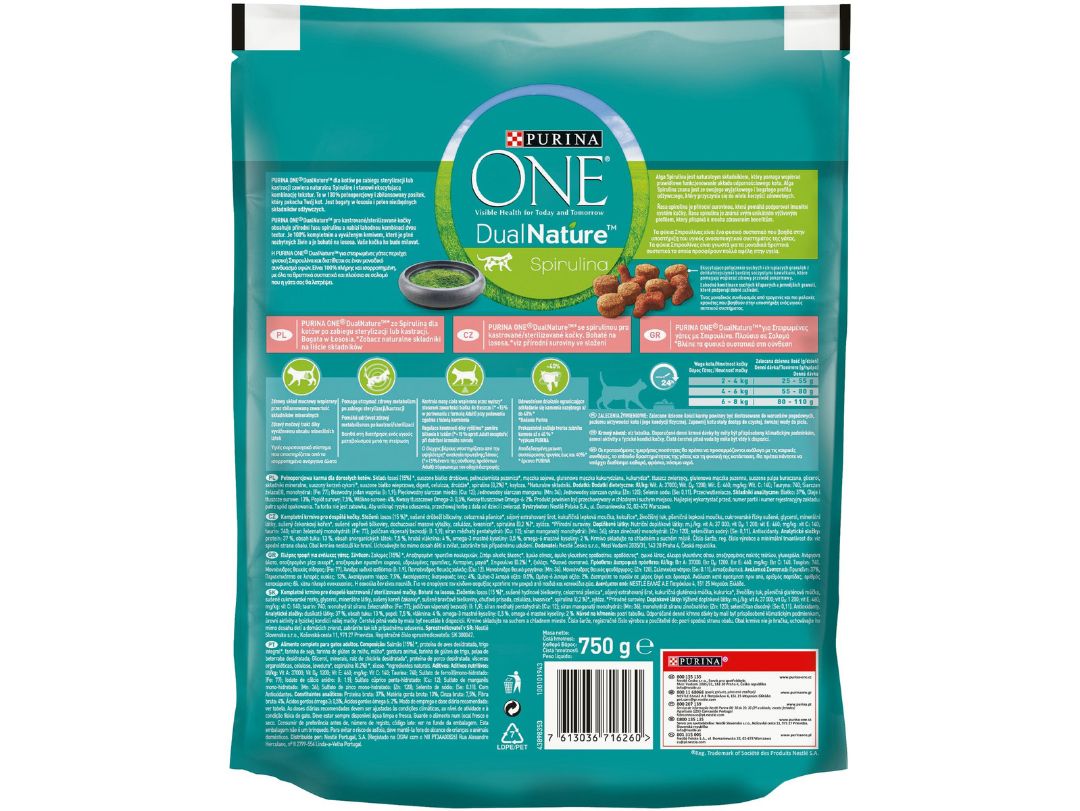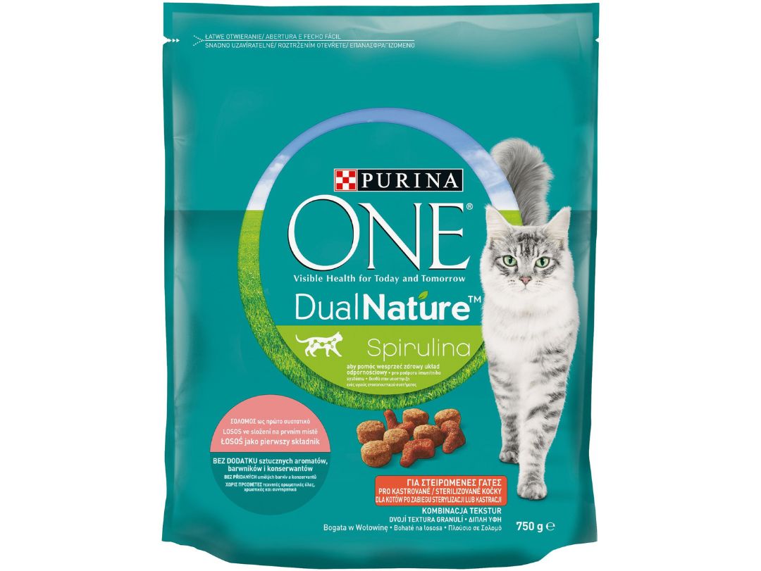 Η PURINA ONE® DualNature™ για στειρωμένες γάτες περιέχει φυσική Σπιρουλίνα και έρχεται σε έναν μοναδικό συνδυασμό υφών.