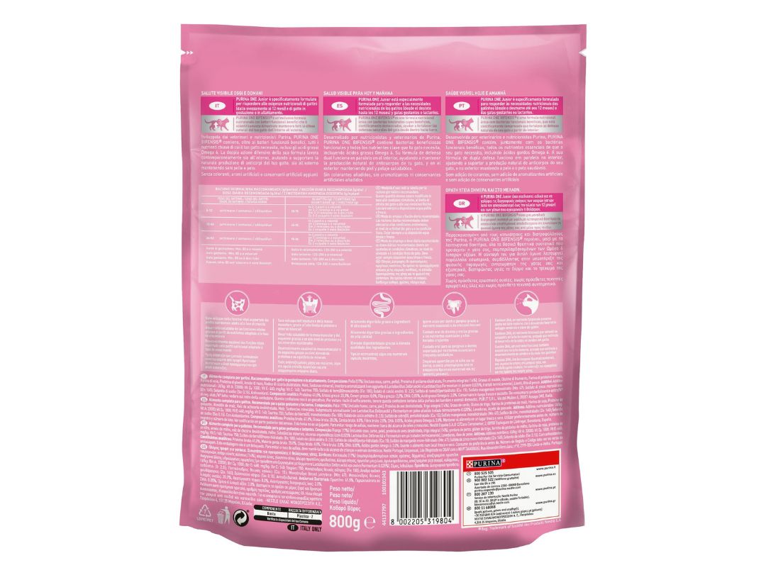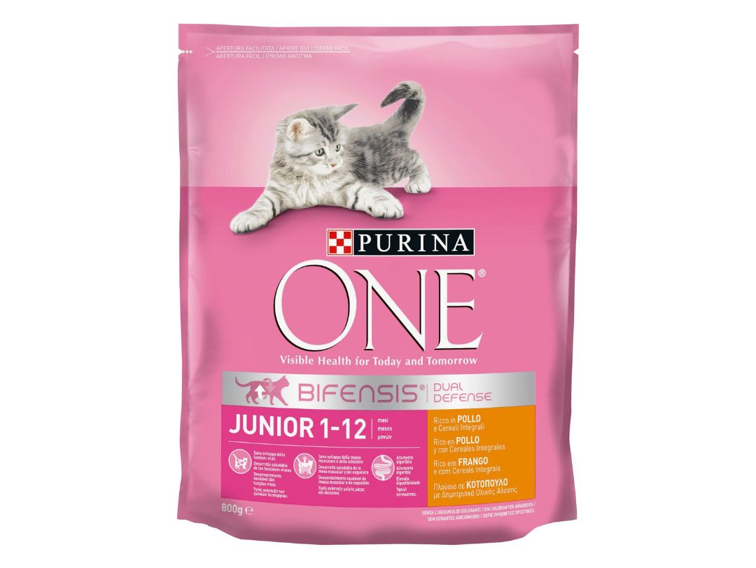 Πλήρης τροφή για γατάκια. Συνιστάται για έγκυες και θηλάζουσες γάτες. Purina ONE Junior Πλούσιο σε Κοτόπουλο & Δημητριακά Ολικής Άλεσης 800g.
