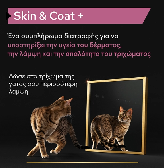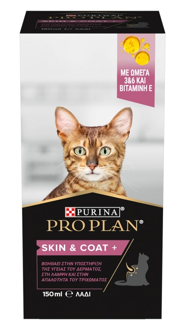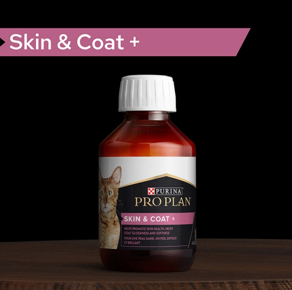 Το PRO PLAN® Skin & Coat + είναι ένα καθημερινό συμπλήρωμα σχεδιασμένο από κτηνιάτρους και διατροφολόγους κατοικίδιων που υποστηρίζει την υγεία του δέρματος (ενυδάτωση και συνοχή) και τη λάμψη του τριχώματος της γάτας σας.